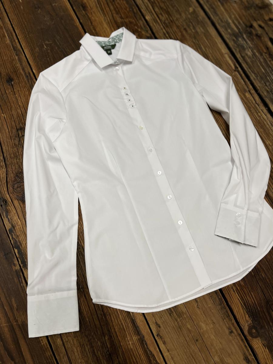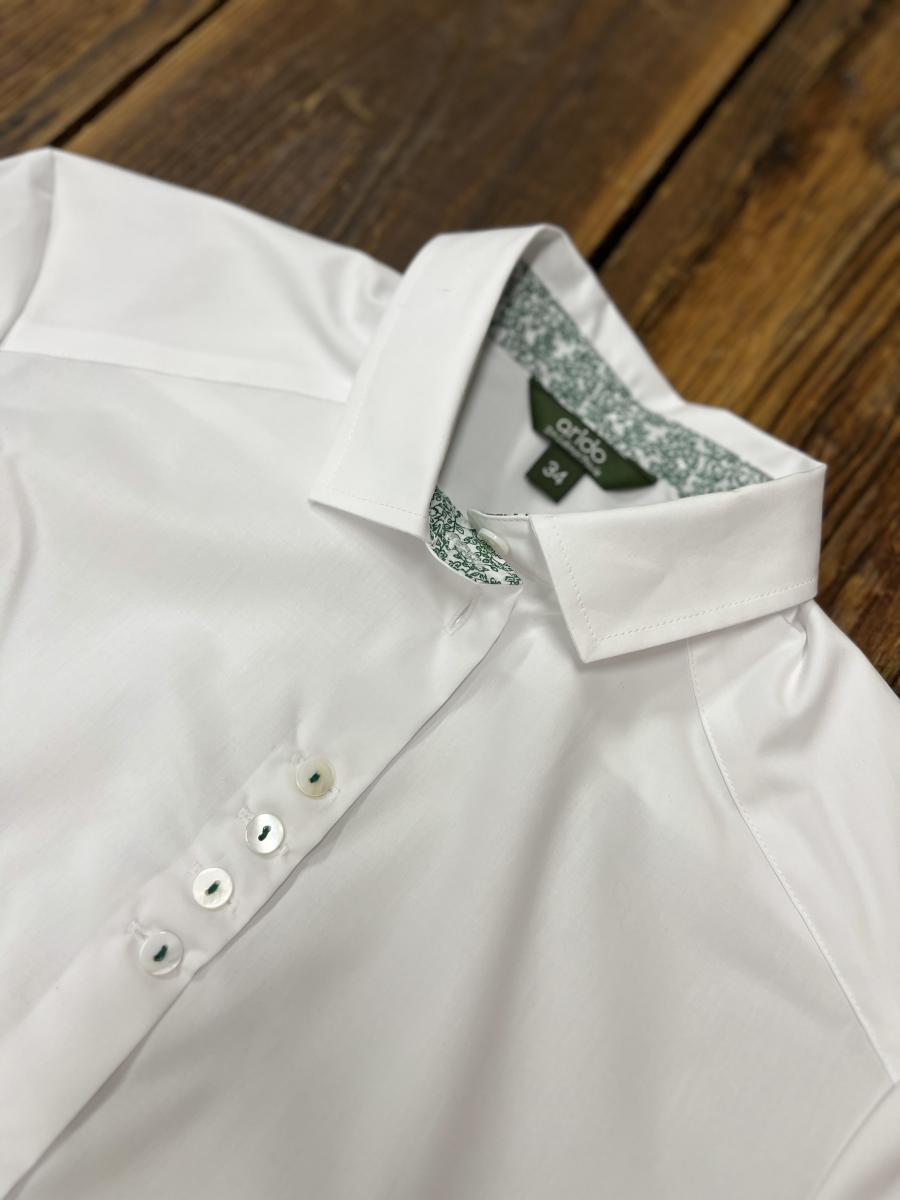 Damenbluse in weiß mit Zierknöpfen im Dekolleté