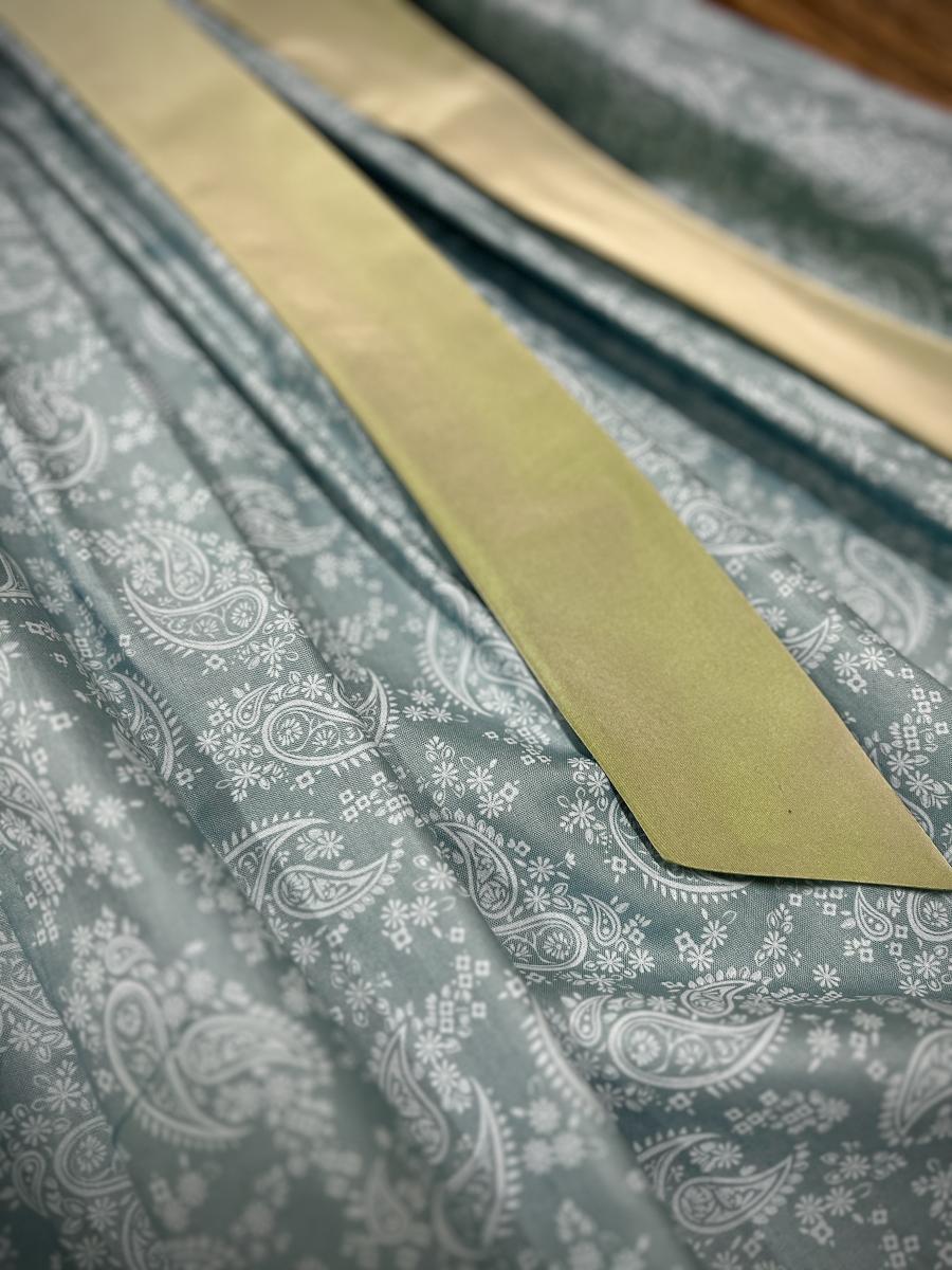 Die Schürze besteht aus einem elgeanten Paisley-Muster und einem breiten Schürzenband in olivegrün.