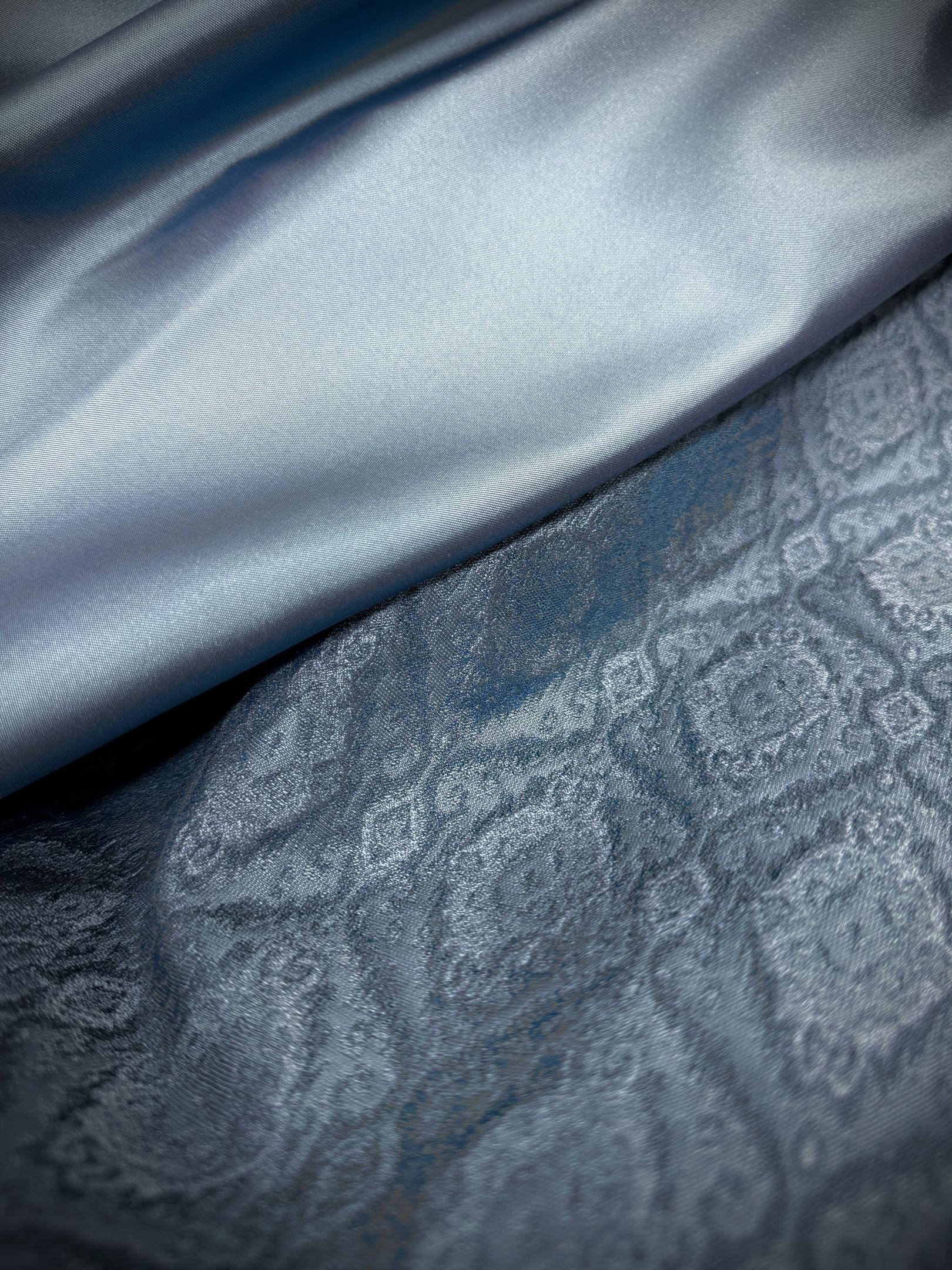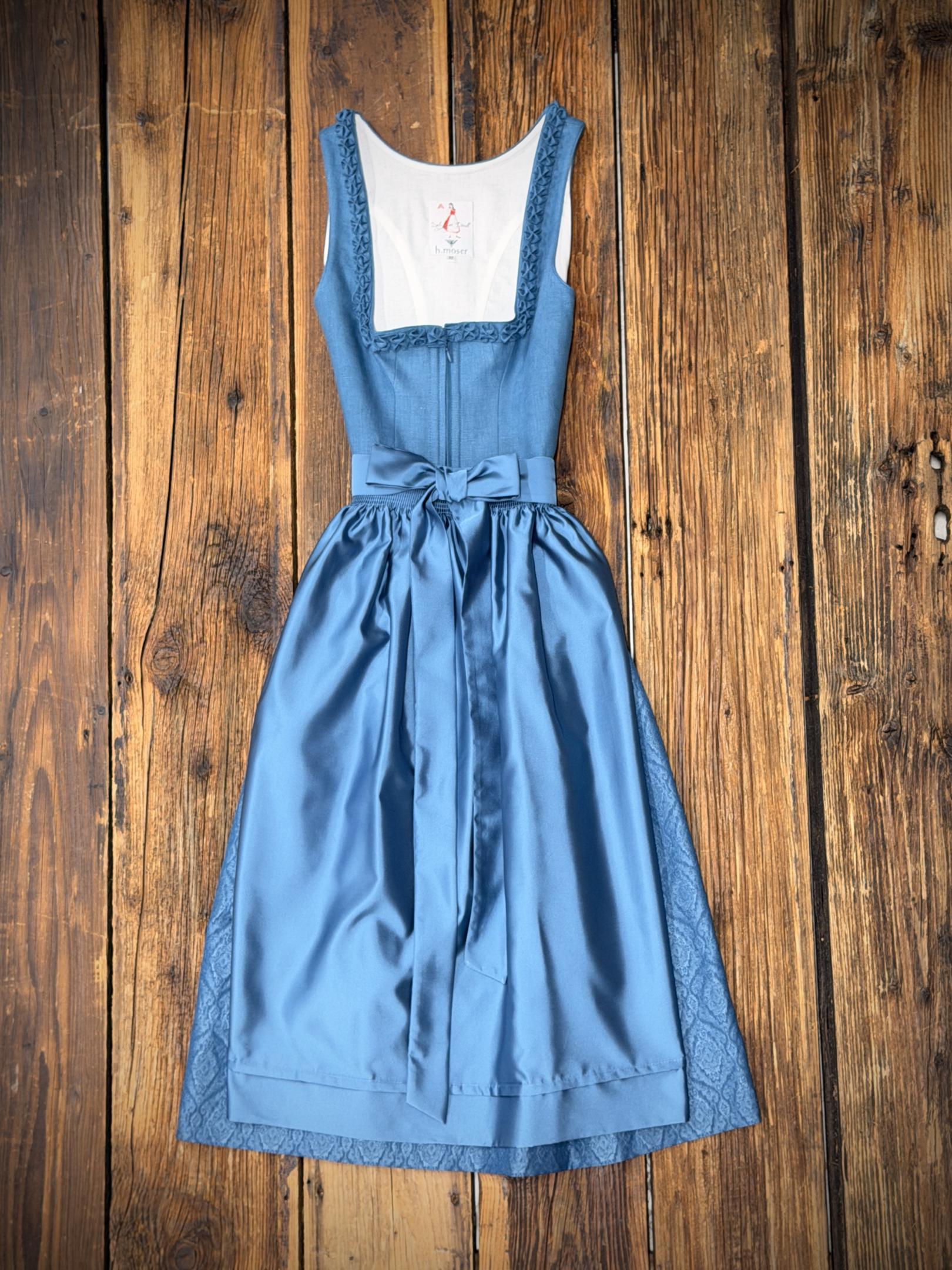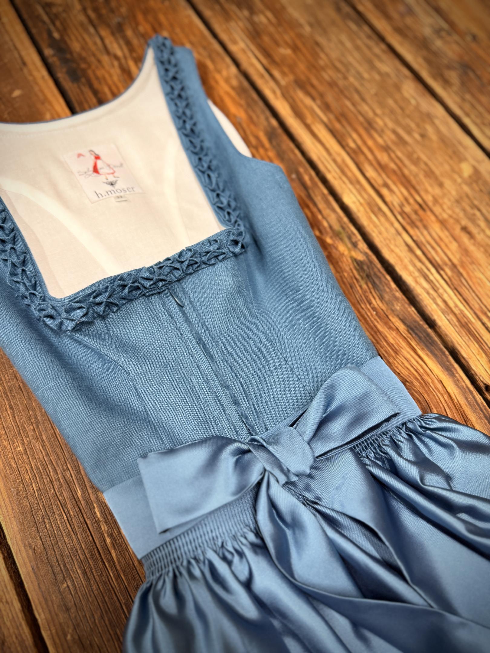 Dirndl in blau mit Oberteil aus Leinenstoff.