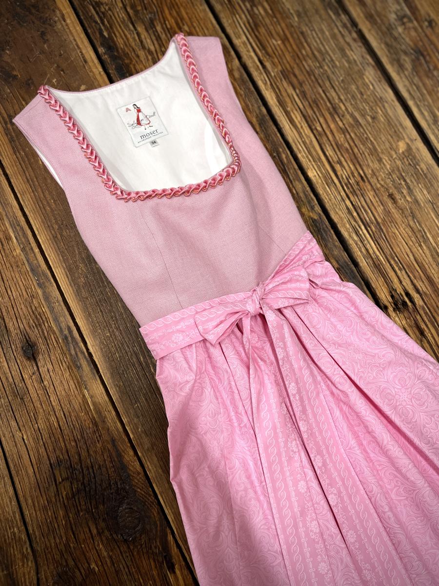 Drindl in erfrischendem rosa mit Oberteil aus Leinenstoff.