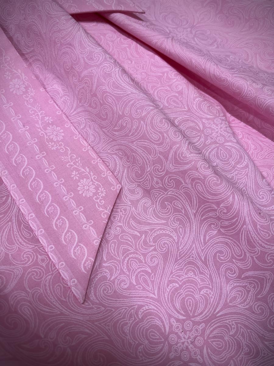 Die Schürze besteht aus einem feinen, floralen Allover-Muster, das ebenfalls in roa gehalten ist.