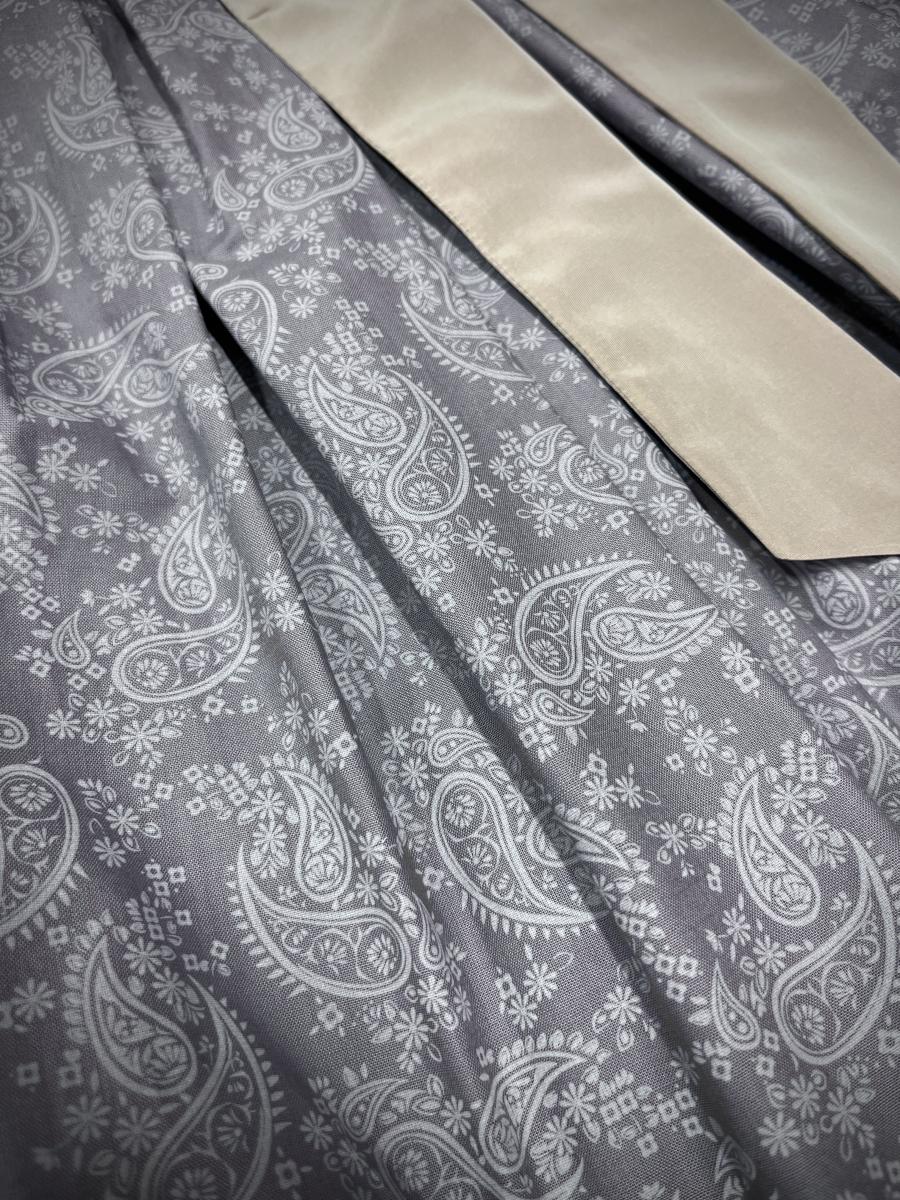 Die Schürze besteht aus einem elgeanten Paisley-Muster und einem breiten Schürzenband in olivegrün.