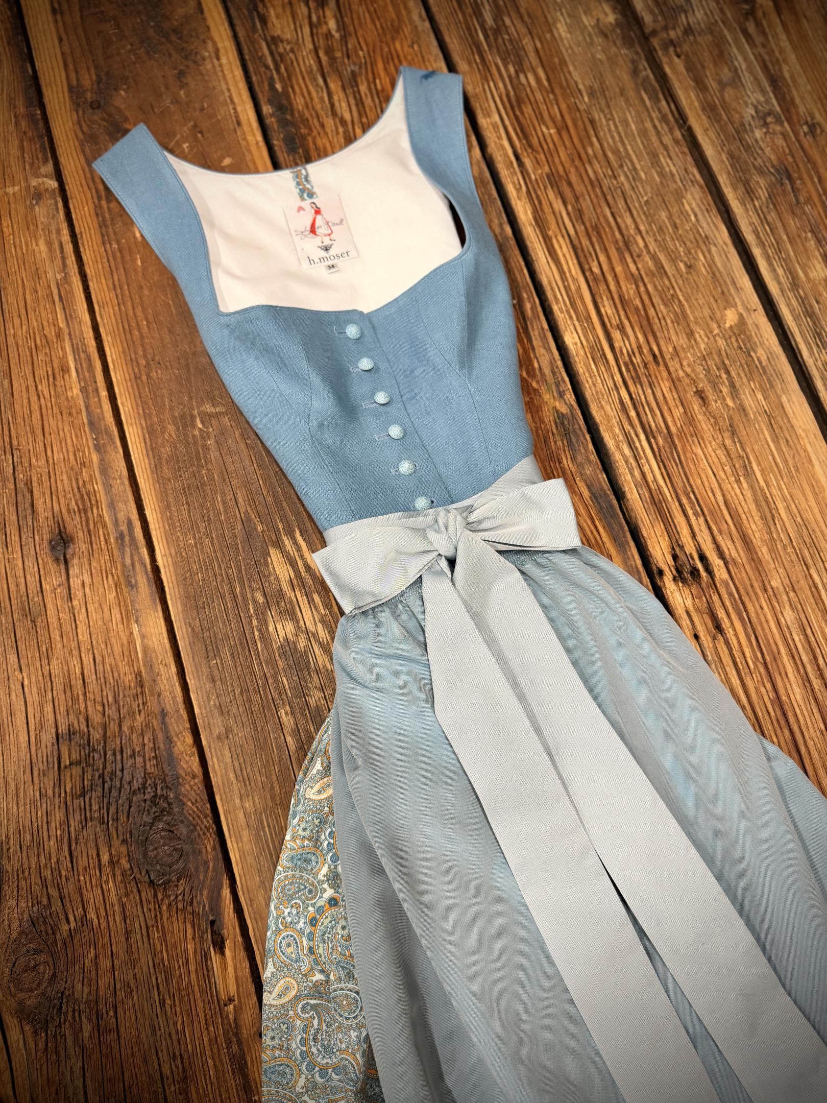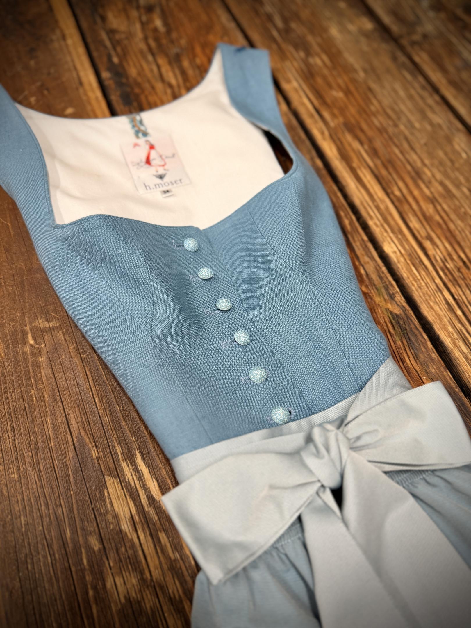Dirndl in petrol mit Oberteil aus Leinenstoff.