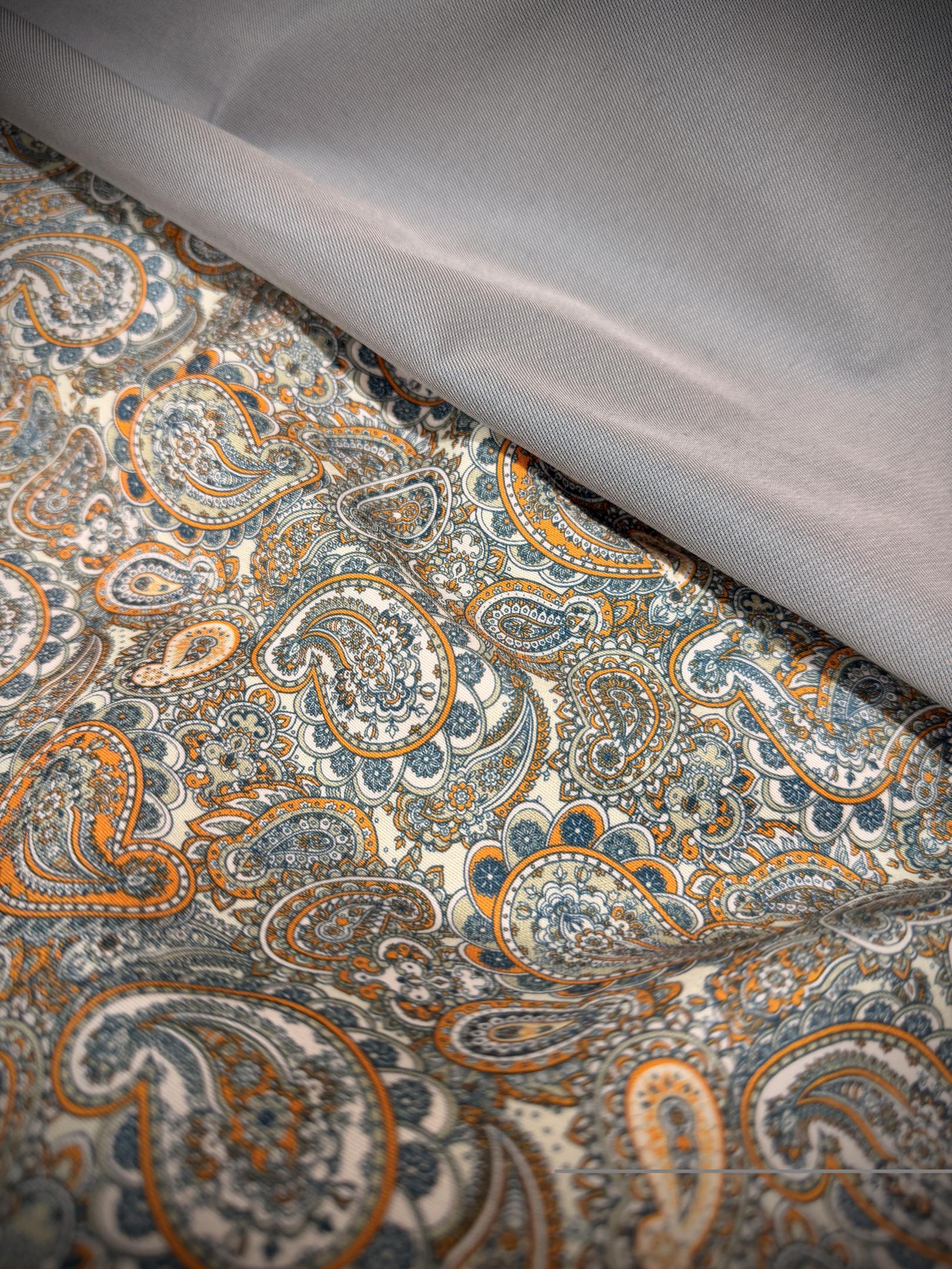Die Schürze besteht aus einem feinen, floralen Allover-Muster, das ebenfalls in petrol gehalten ist.