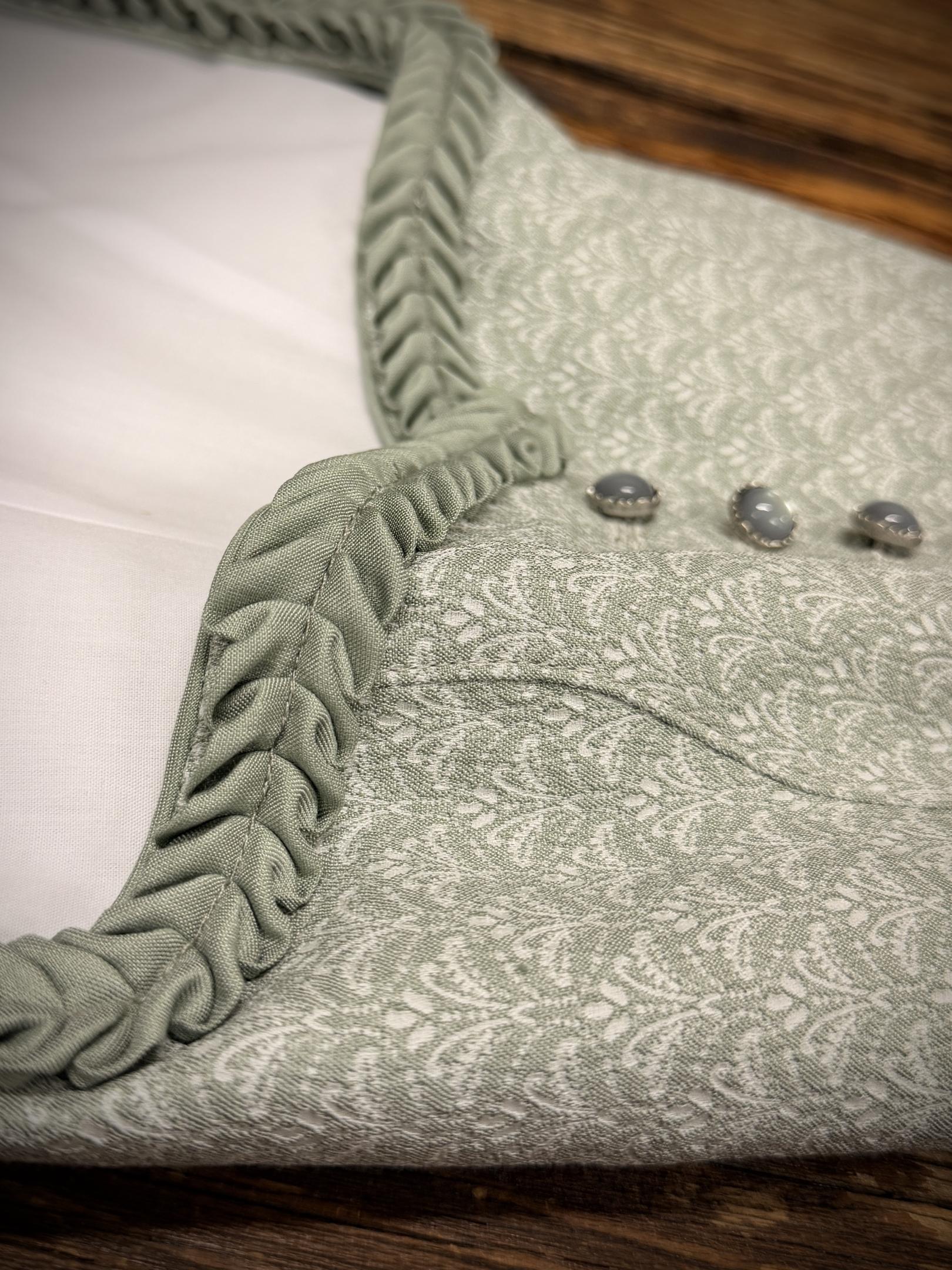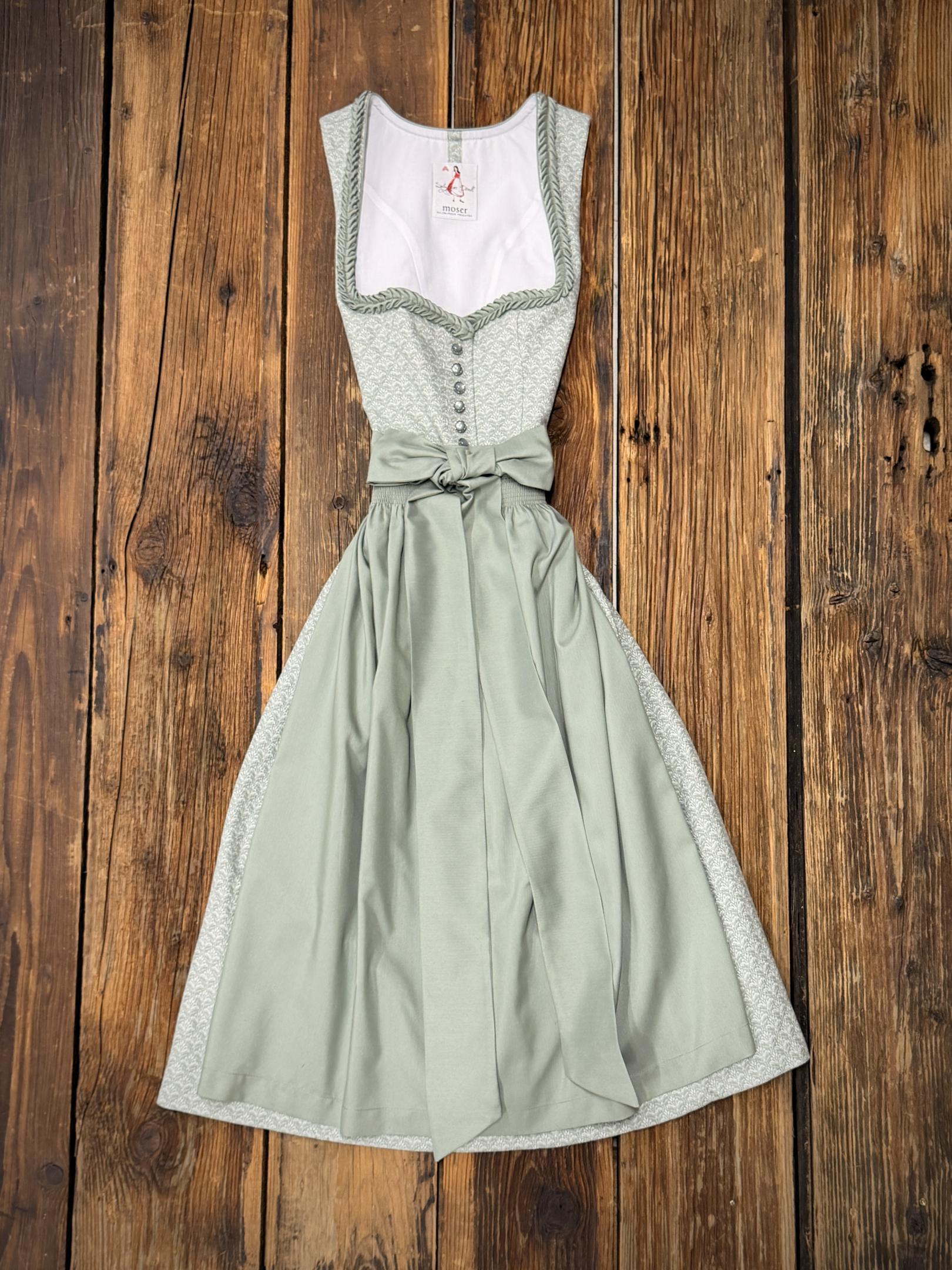 Dirndl in der Farbe Salbei mit Mieder Aussschnitt und Herzerlrüschen.