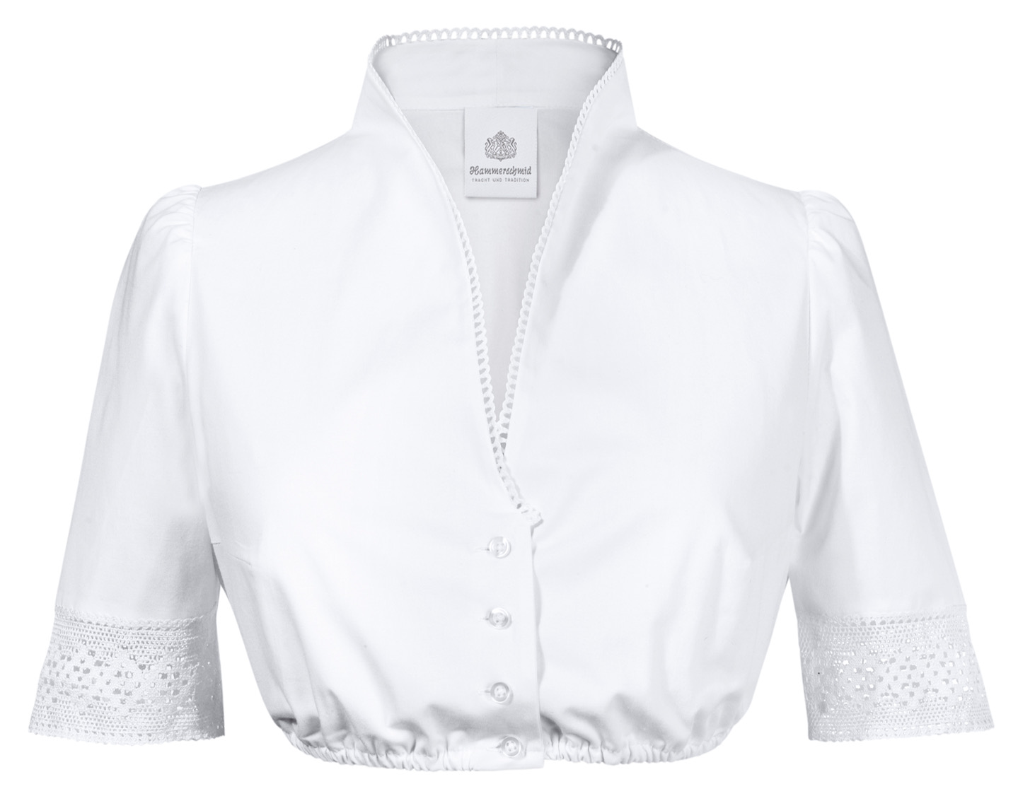 Kurzarm Dirndlbluse mit Stehkragen in feiner Sitzenborte eingefasst.
