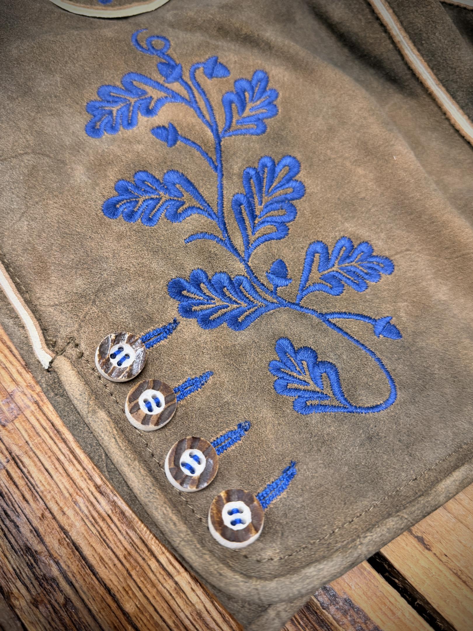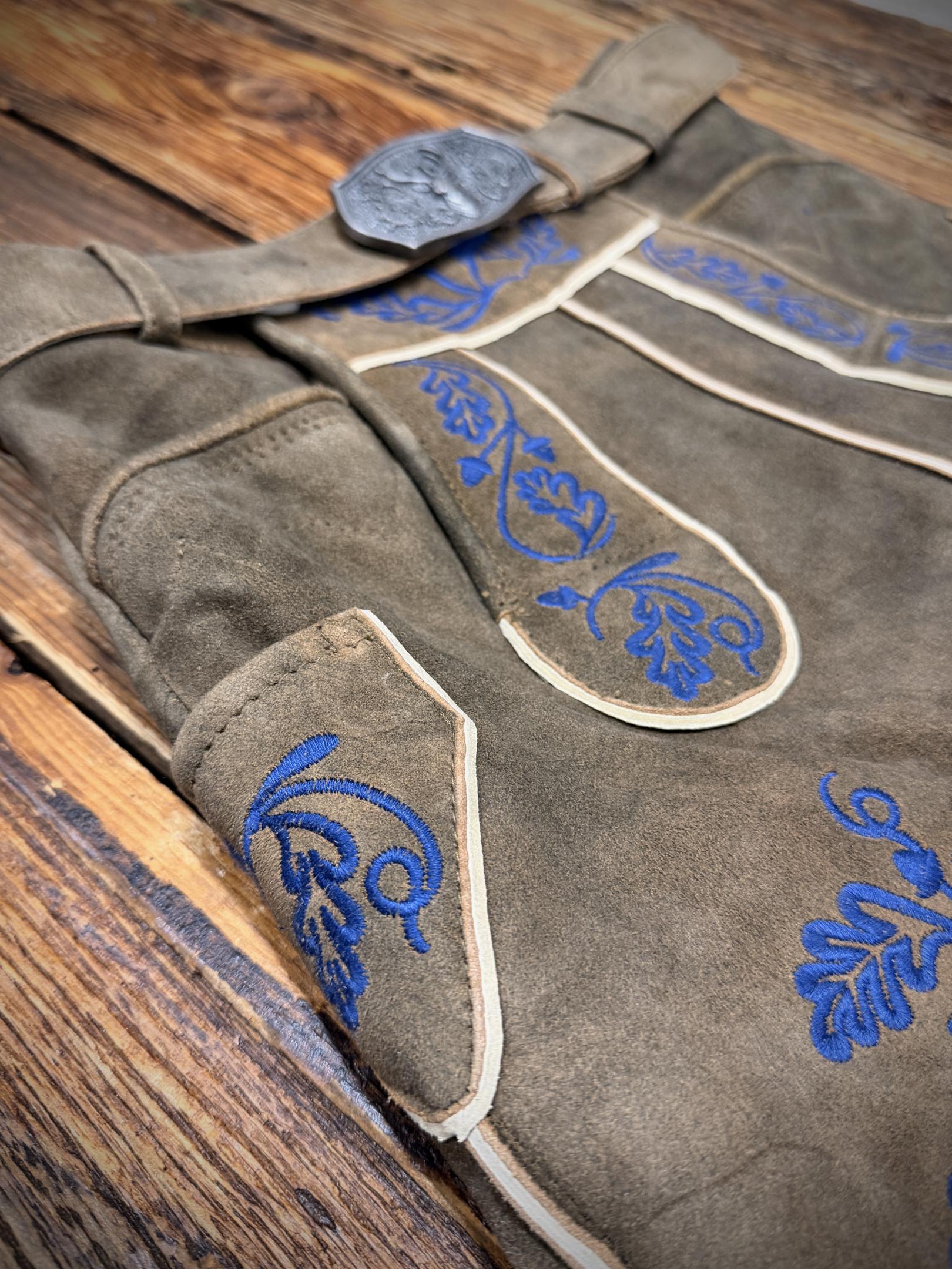 Auffällige, detailreiche blaue Eichenlaub-Stickereien sowie die passende Messertasche verleihen der Lederhose eine besondere Note!