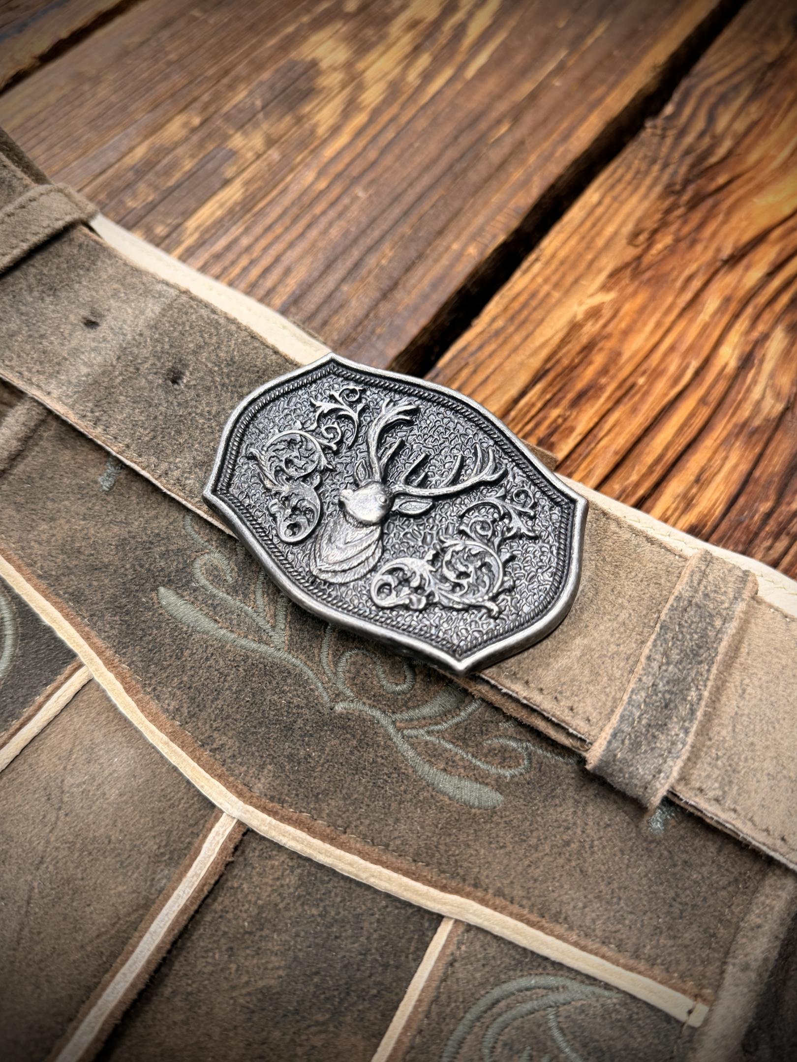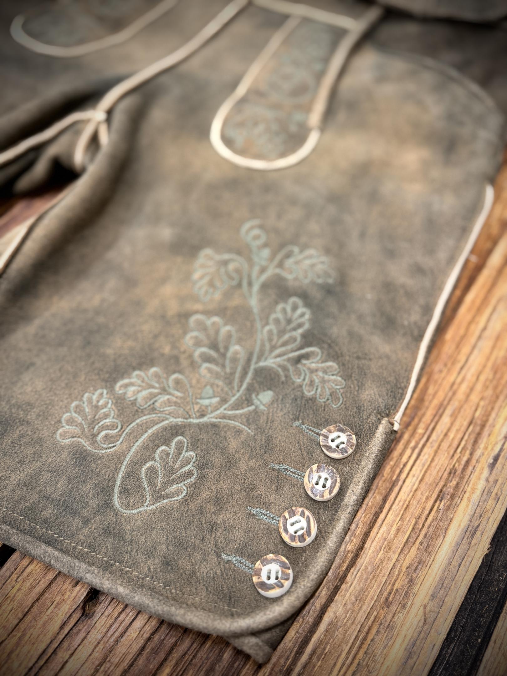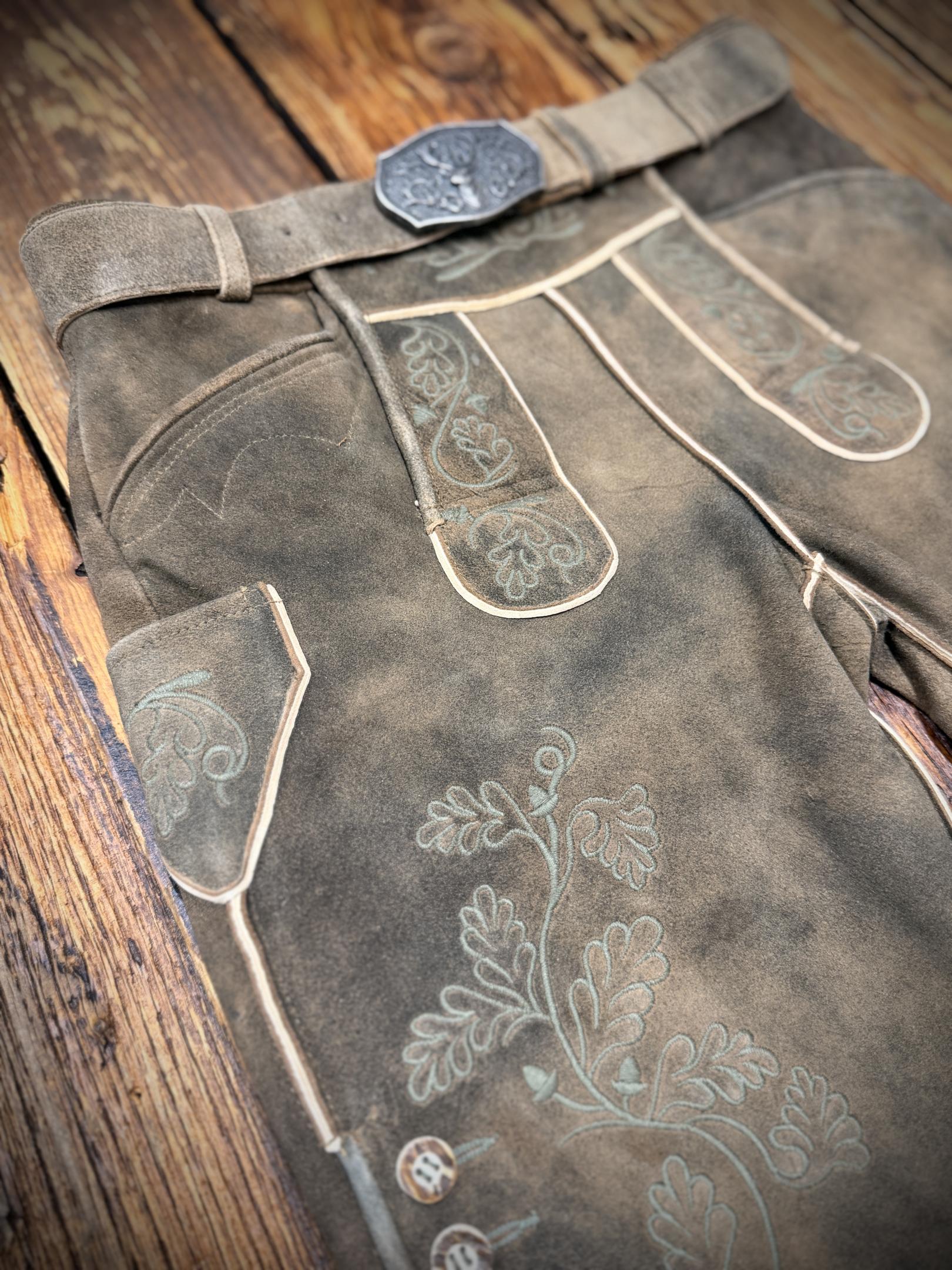 Kurze Herrenlederhose mit Gürtel in einem gedeckten oliv- bis graubraunen Ton mit leichtem Vintage-Look.