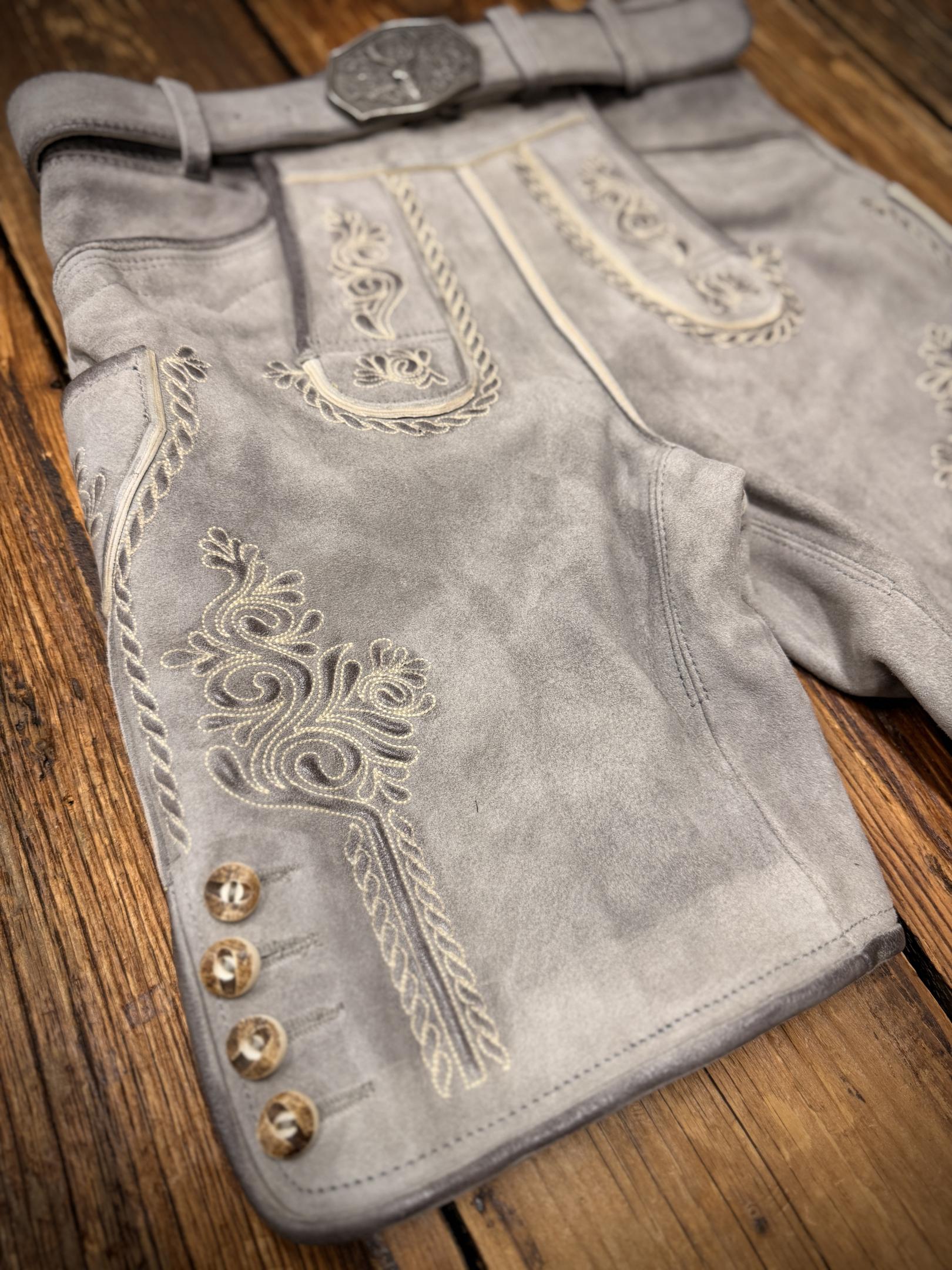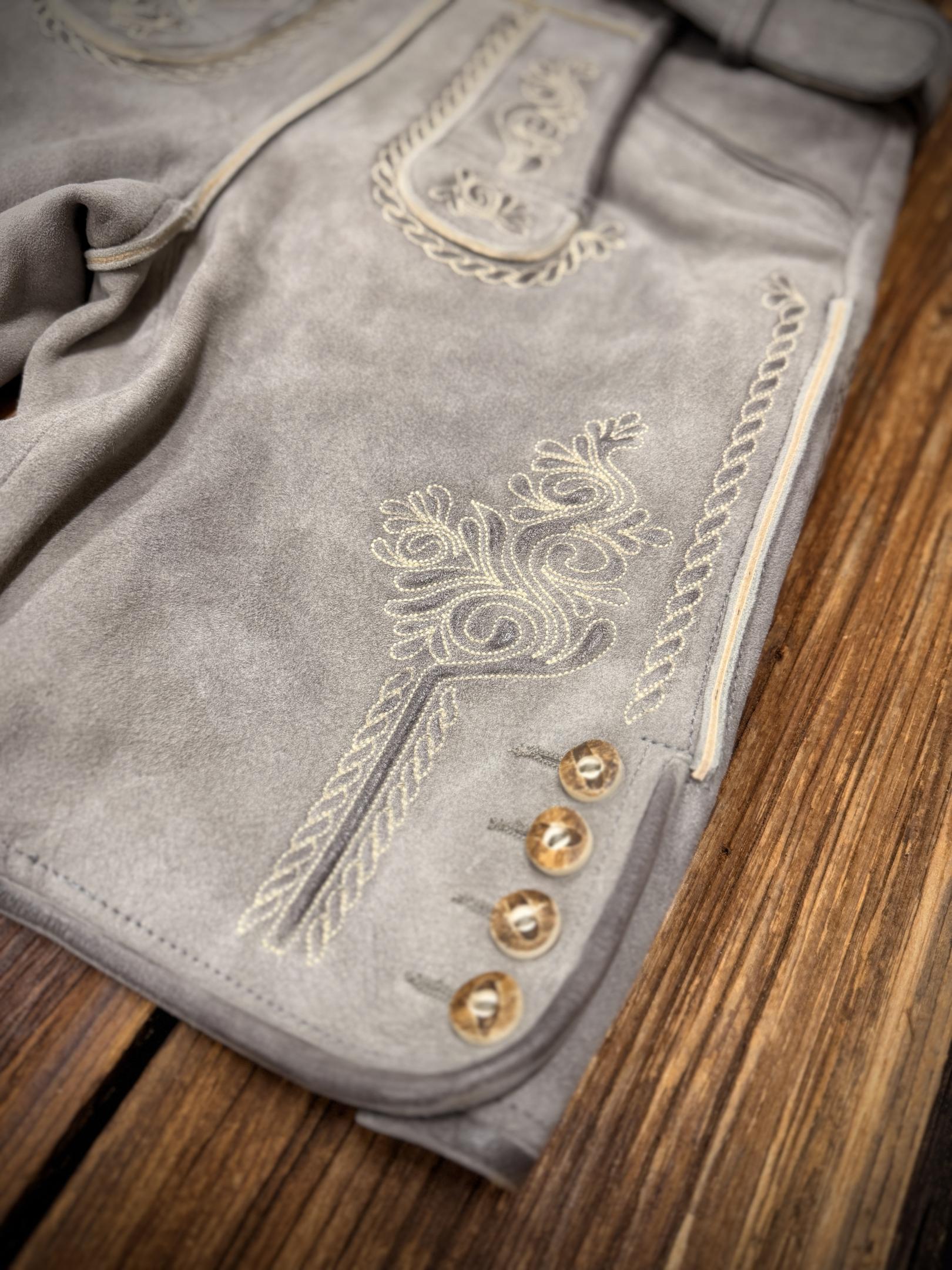 Feine, dezente helle Stickereien auf den Hosenbeinen sowie am Latz sowie eine bestickte Messertasche.