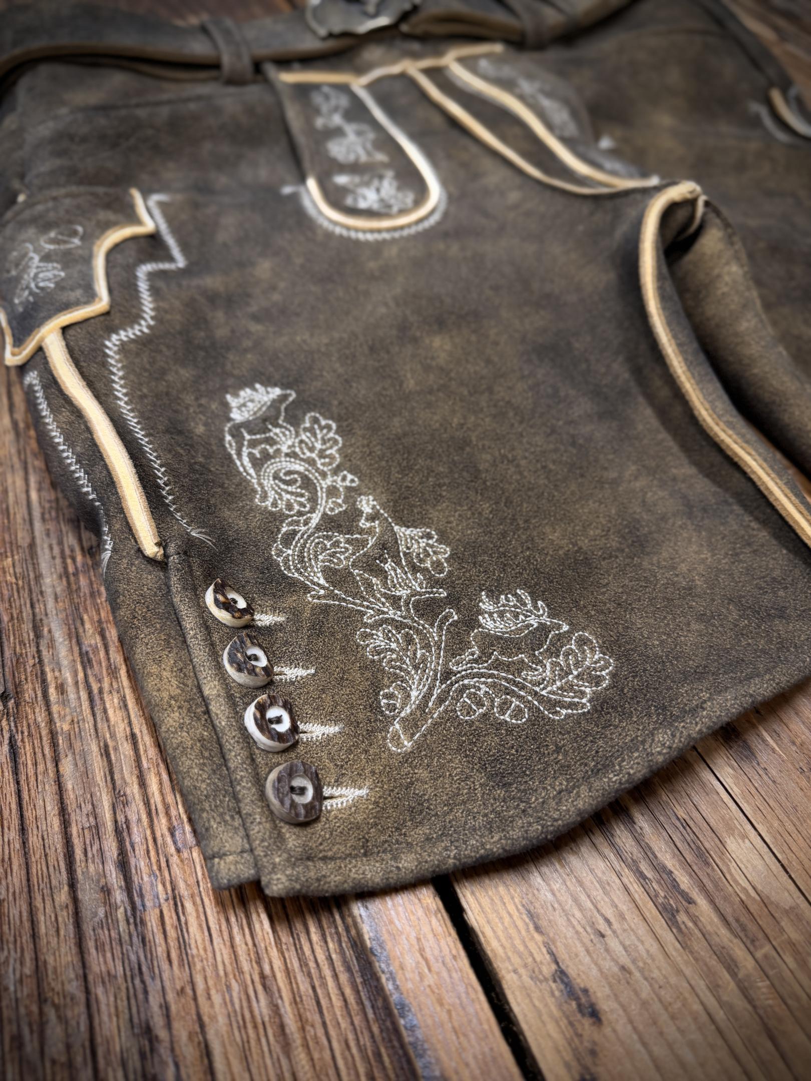 klassische Lederhose ohne starke Farbkontraste, dafür vielfältig kombinierbar und sehr langlebig.
