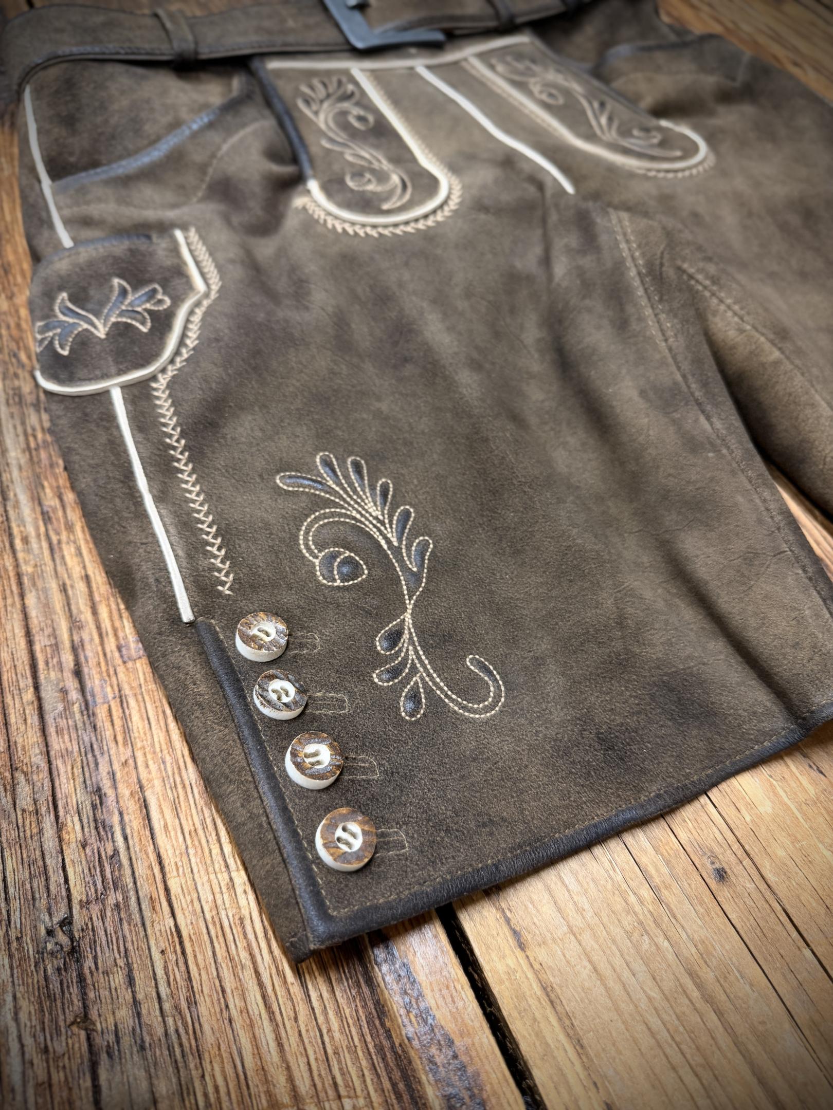 Kurze Herrenlederhose mit Gürtel und schlichter Schnalle.