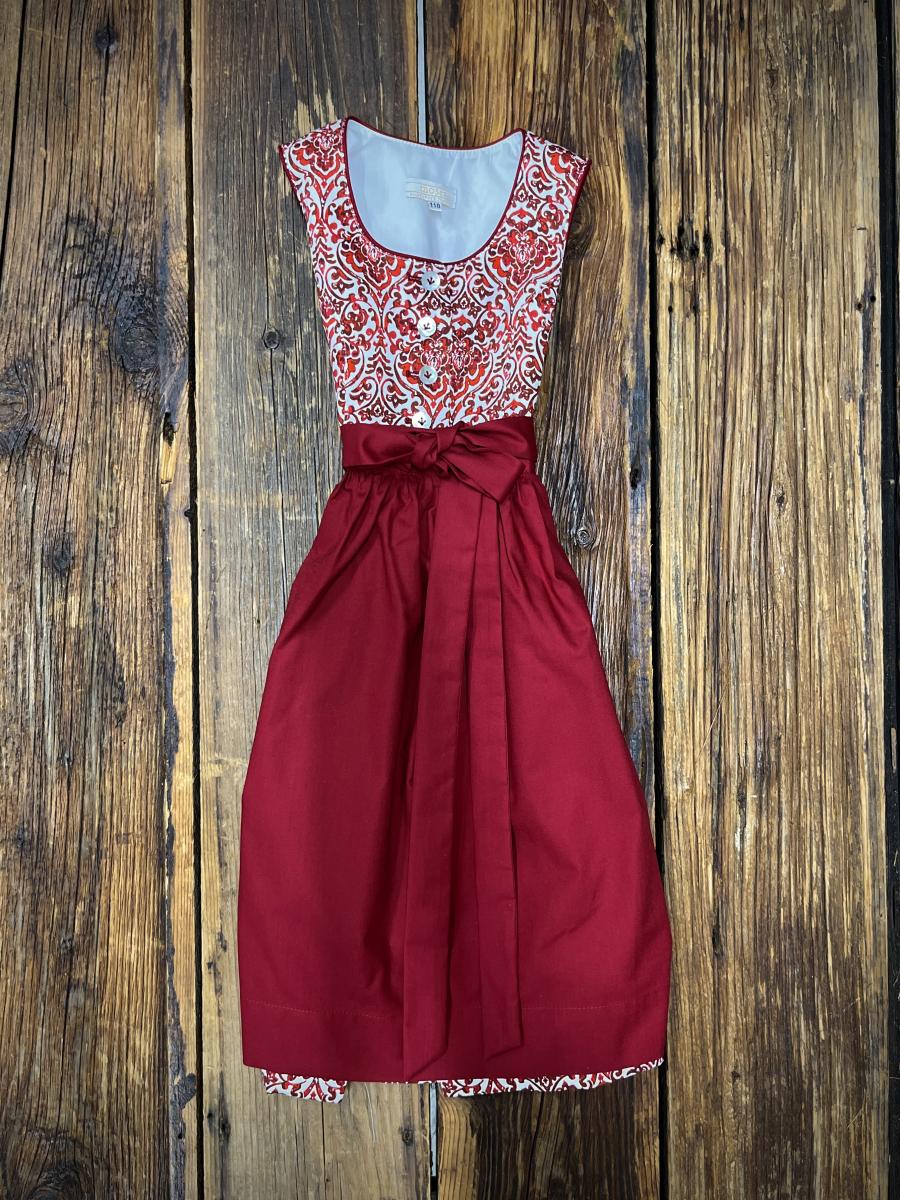 Kinderdirndl in rot mit floralem Muster und Taftschürze in rot.